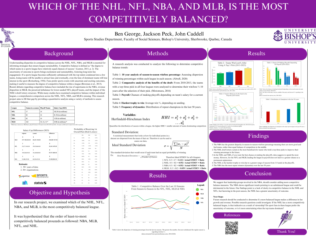 Research posters analyzing competitive balance across NHL, NFL, NBA, and MLB using metrics like win-loss percentages, draft lottery systems, salary caps, dynasty frequency, and HHI index, examining which league maintains the most balanced competition and fan preferences for uncertainty versus predetermined outcomes.