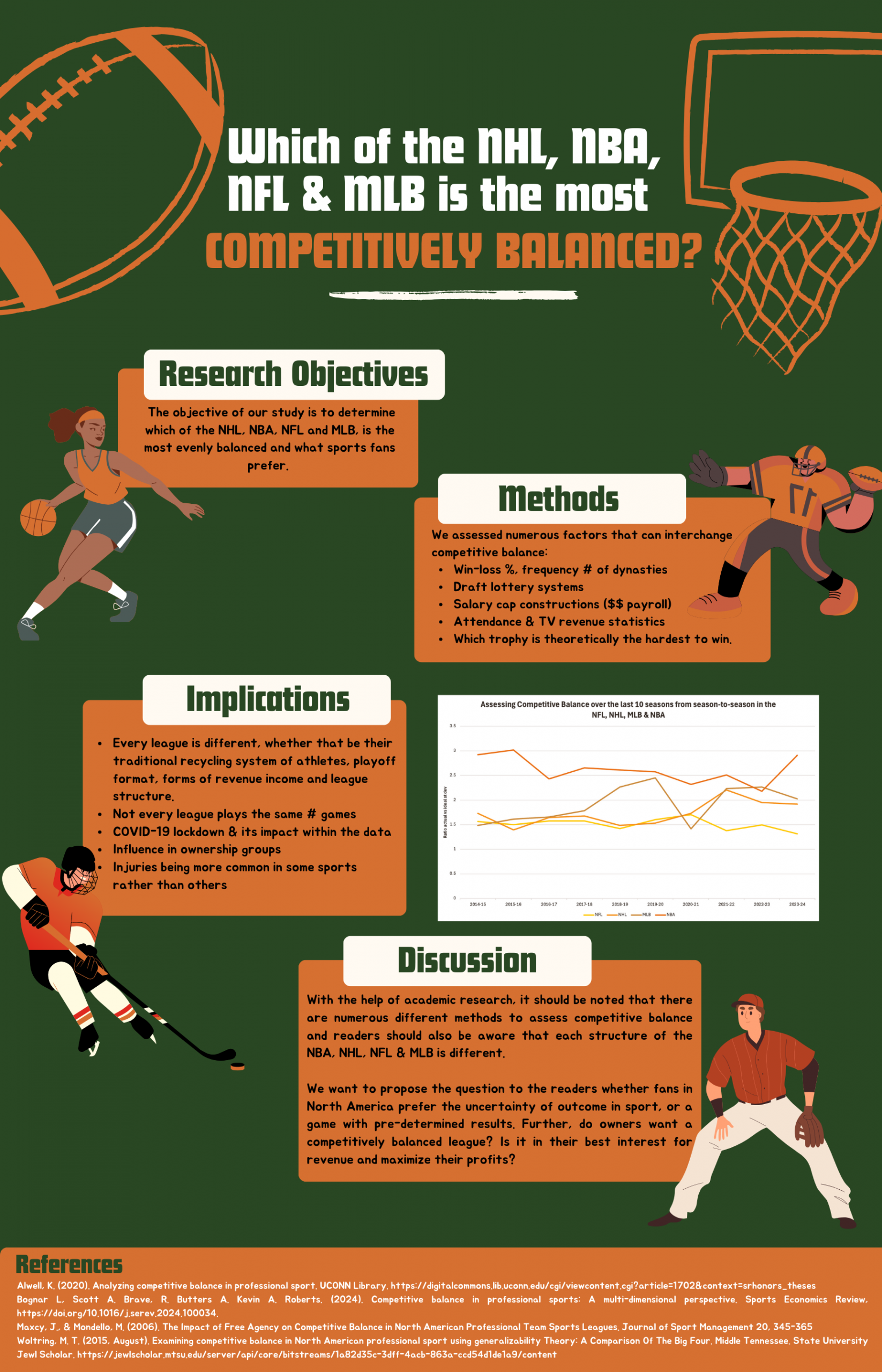 Research posters analyzing competitive balance across NHL, NFL, NBA, and MLB using metrics like win-loss percentages, draft lottery systems, salary caps, dynasty frequency, and HHI index, examining which league maintains the most balanced competition and fan preferences for uncertainty versus predetermined outcomes.